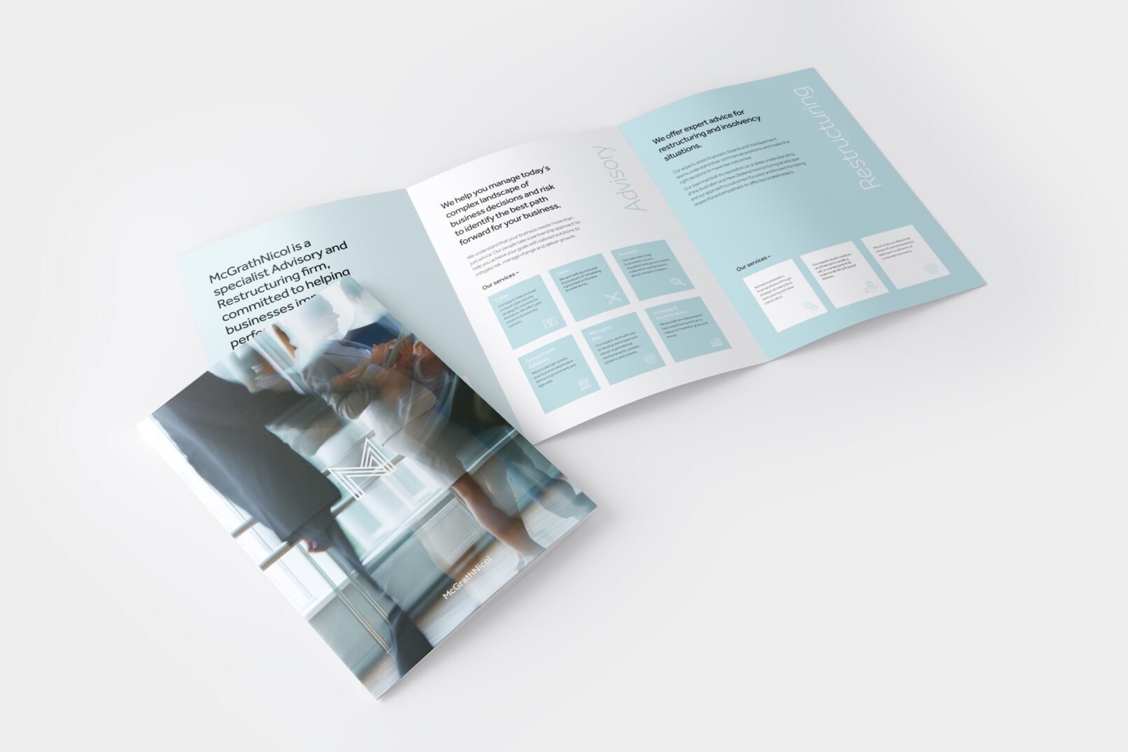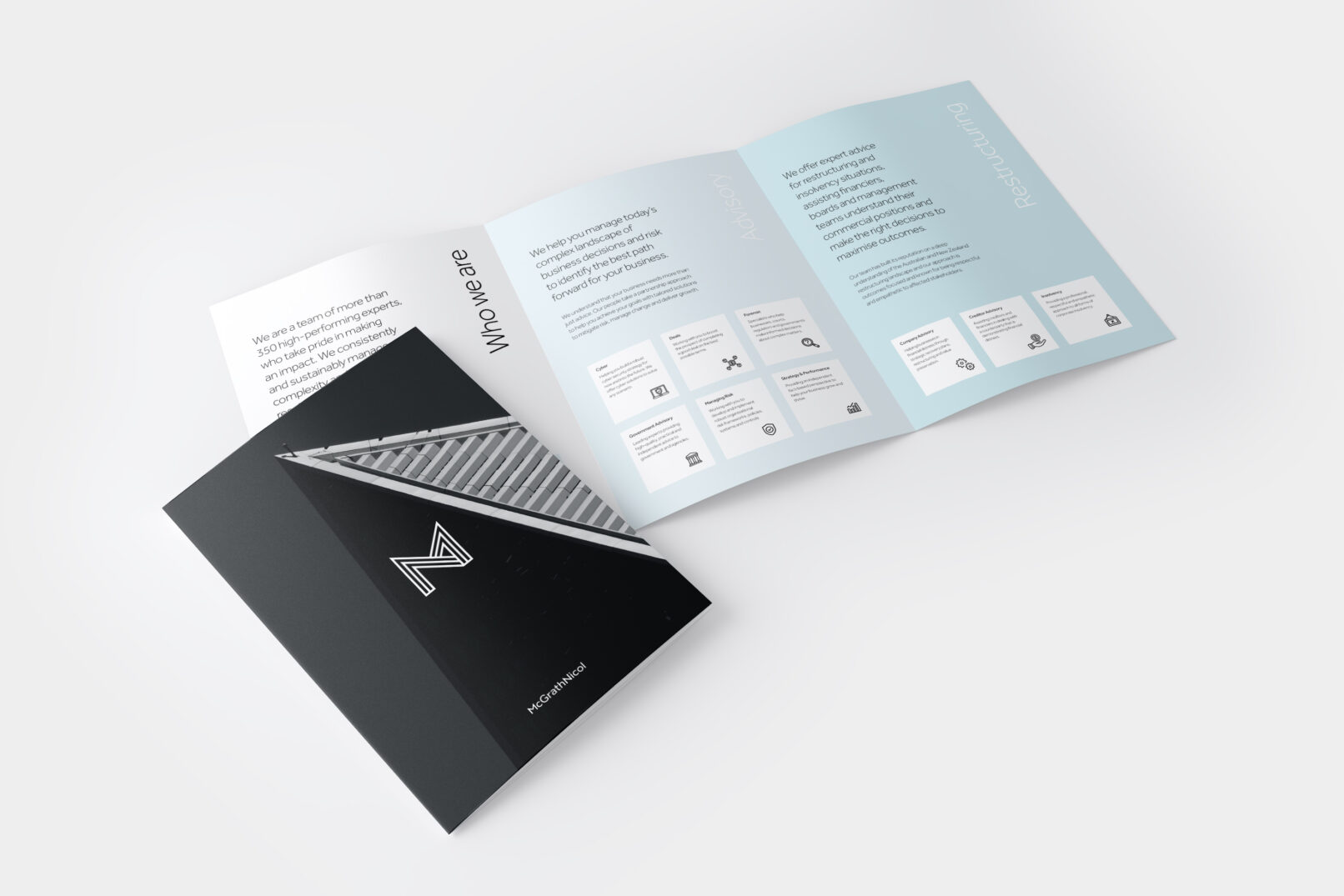 I recently designed this tri-fold brochure, which is aligned to the new website branding I developed. It showcases the services, expertise and value proposition of the advisory firm McGrathNicol. This brochure is printed with special finishes and displayed in the reception offices located around Australia. Below are a few different concepts of the brochure I created, which show a refreshing twist on the company brand. Each of these designs effectively communicate the firm’s brand identity, strengths and capabilities to potential clients and stakeholders.